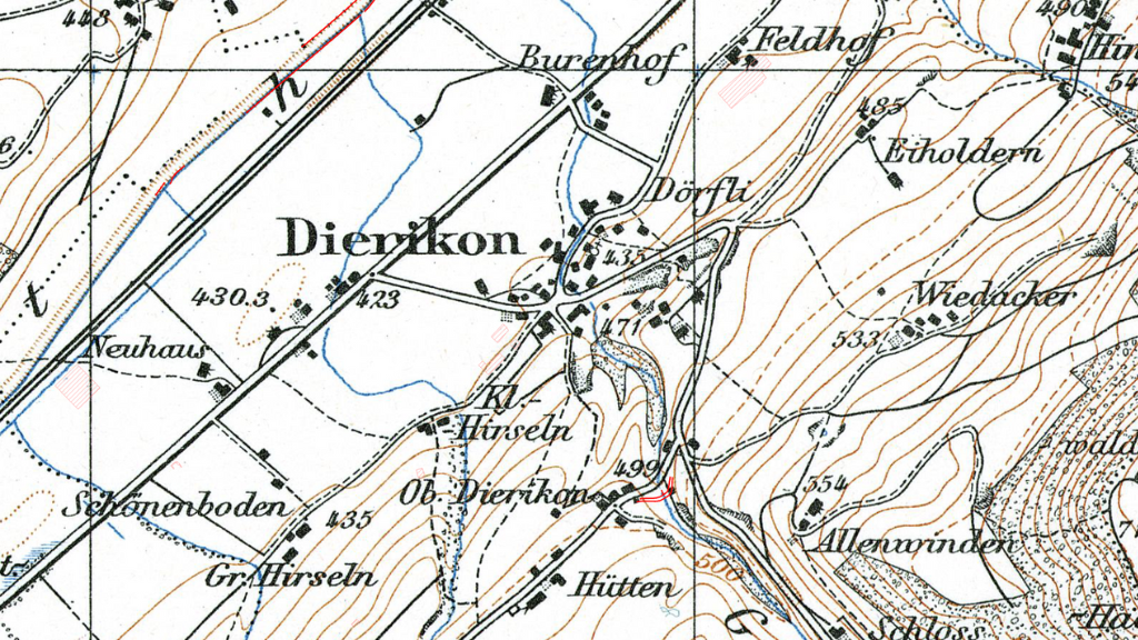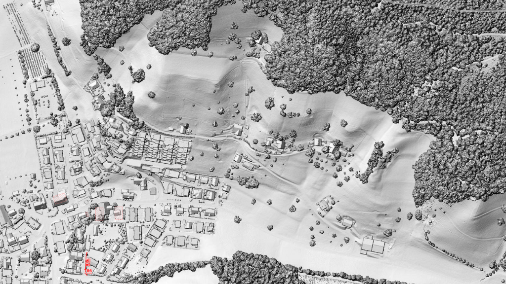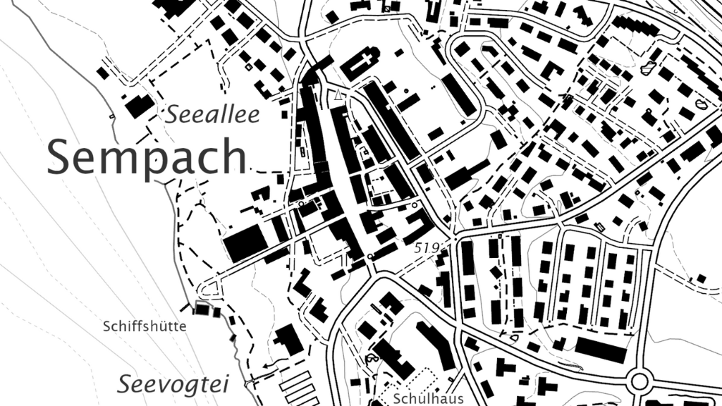 Farbiger Ortsplan aus Daten der amtlichen Vermessung, kombiniert mit schattiertem Geländerelief abgeleitet aus dem digitalen Höhenmodell DTM-AV. Das topographische Planwerk enthält Gebäude, Strassen (beschriftet), Eisenbahnen, Gewässer, Wald, Höhenlinien und -koten, Lokalnamen und Weiteres. Der Ortsplan eignet sich einerseits für die Überlagerung mit thematischen Karten wie z.B. Points of Interest, wie Bushaltestellen, öffentlichen Parkplätzen, Spielplätzen, Einkaufszentren, Altersheimen oder Recyclingstellen und andererseits als eigenständige topografische Karte.